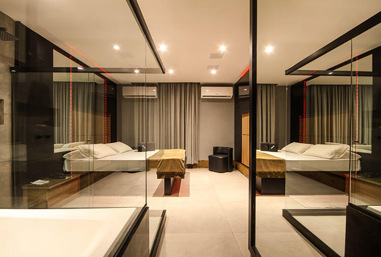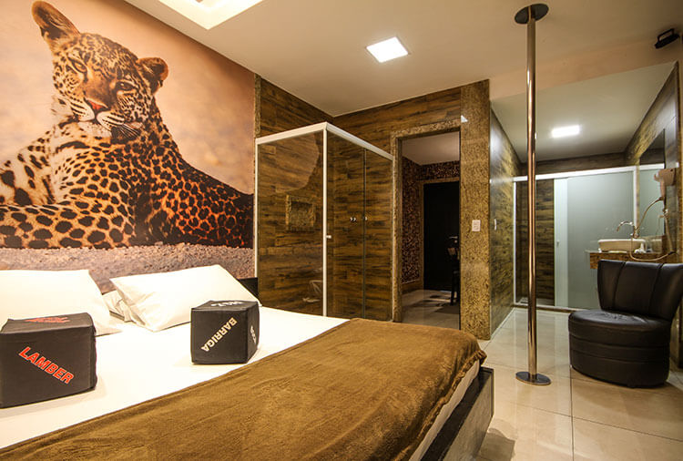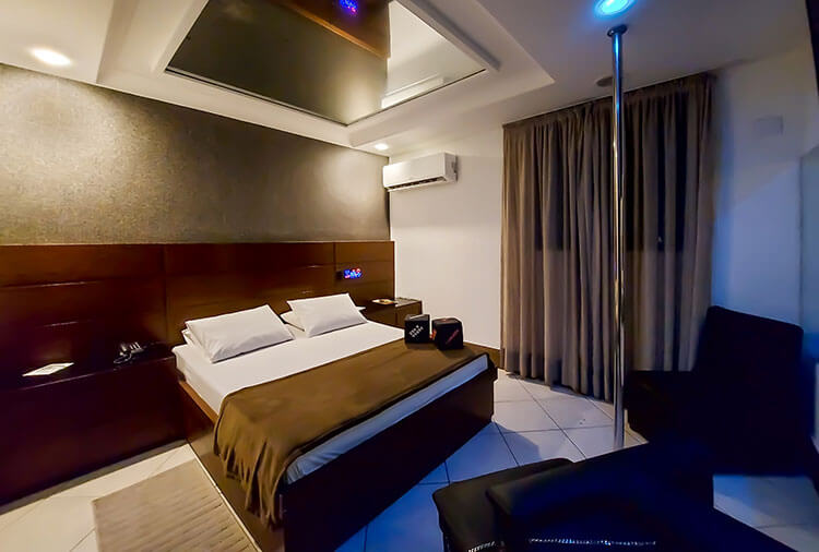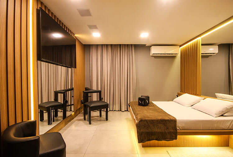 3 canais eróticos,ar-condicionado split,canal de futebol,cavalinho erótico,espelho na parede,frigobar,garagem privativa,piscina aquecida com cascata e iluminação por leds,pole dance,poltrona,saleta para refeições,secador de cabelo,sex shop,som AM/FM com entrada USB e Bluetooth,TV 65",TV a cabo,TV LED 43",TV na piscina